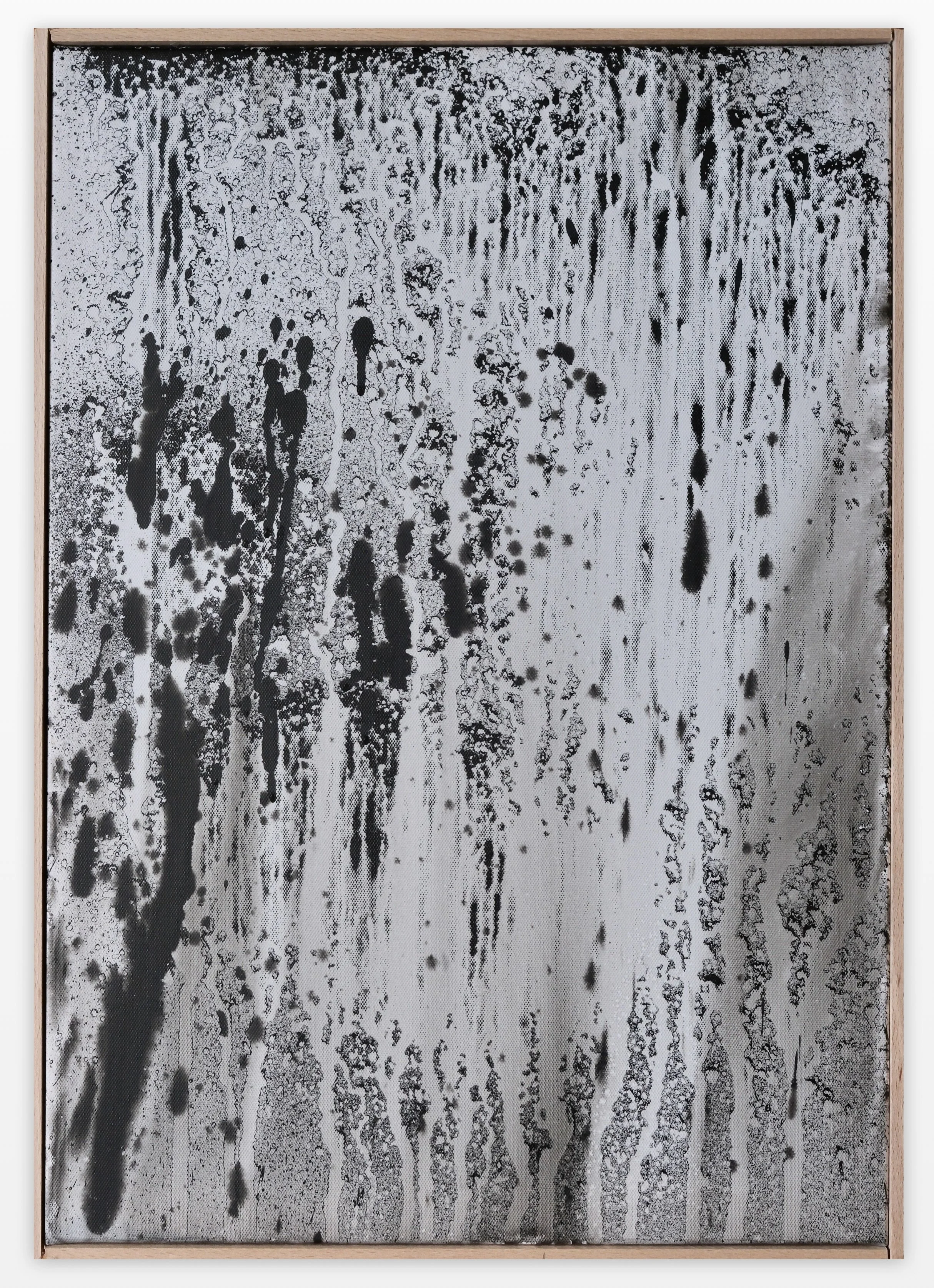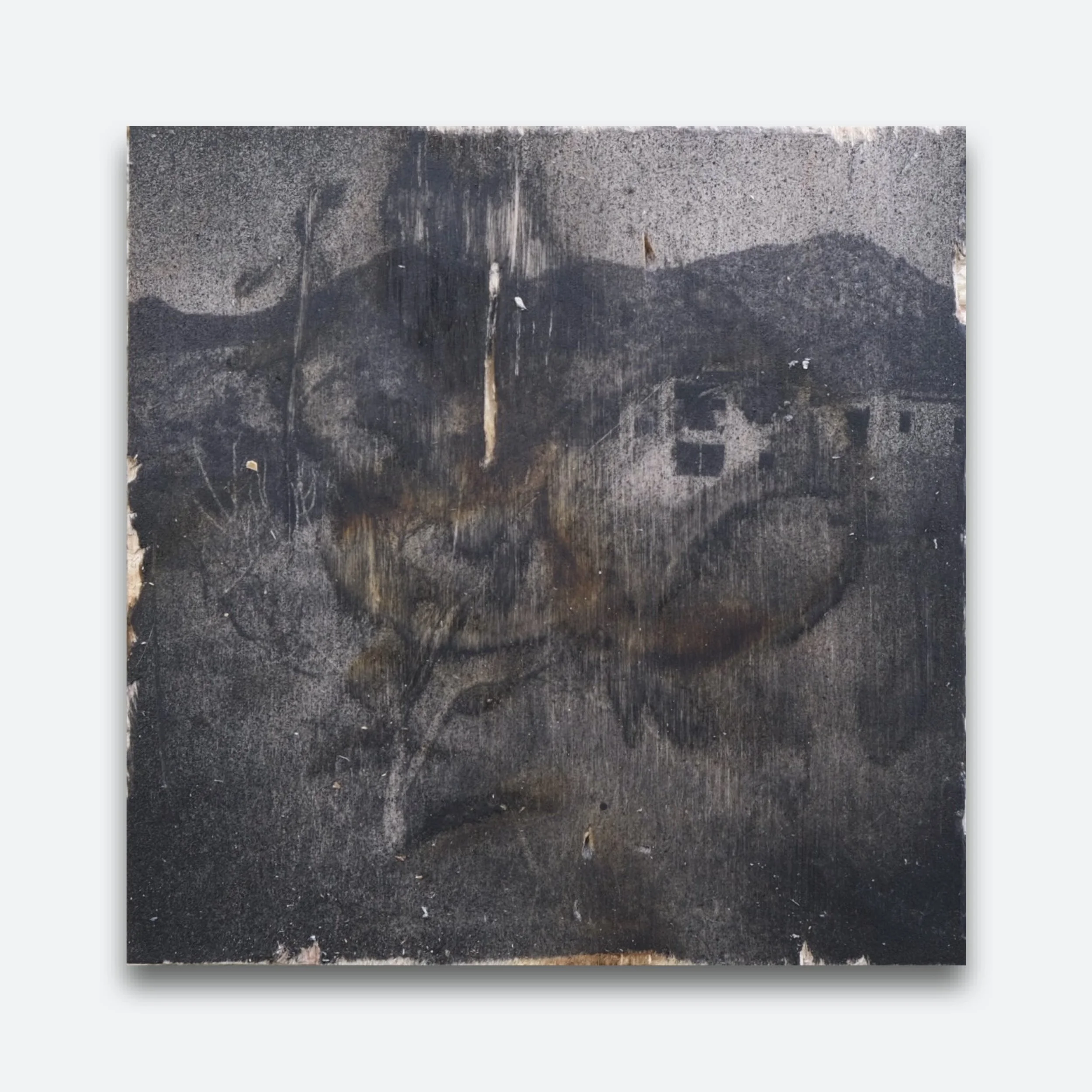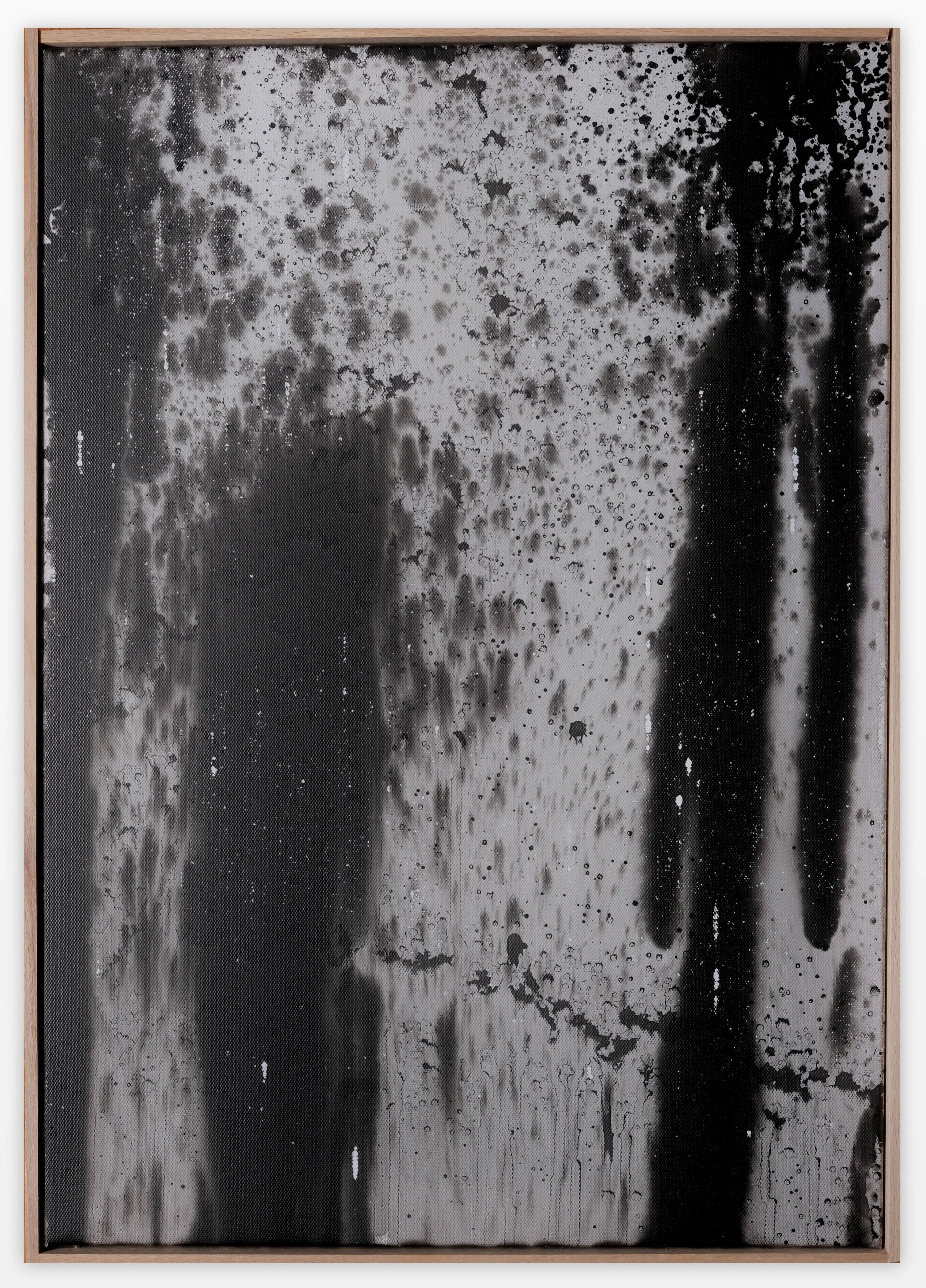 Monochrome inkjet, paper, ink, acrylic, emulsion, water, lacquer, spraypaint, pigments, nature materials on canvas, 70 x 100 cm, unique
