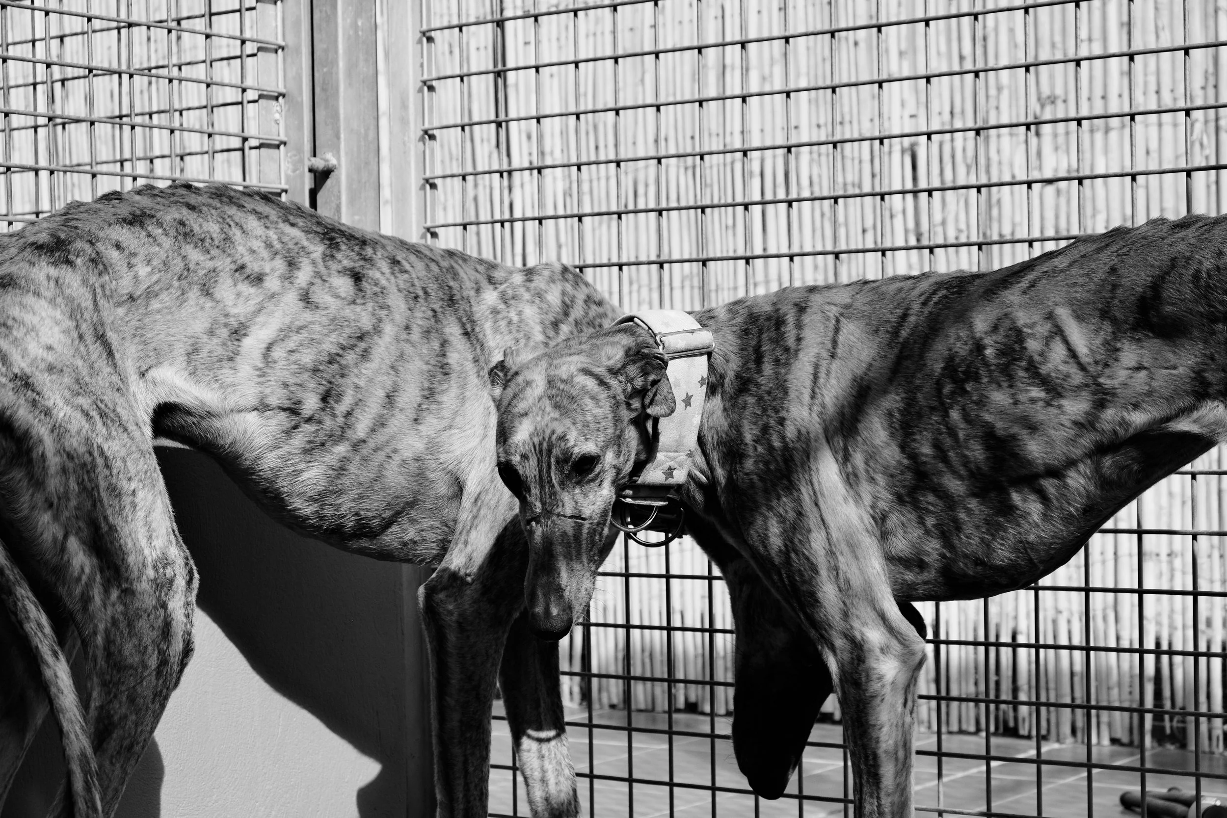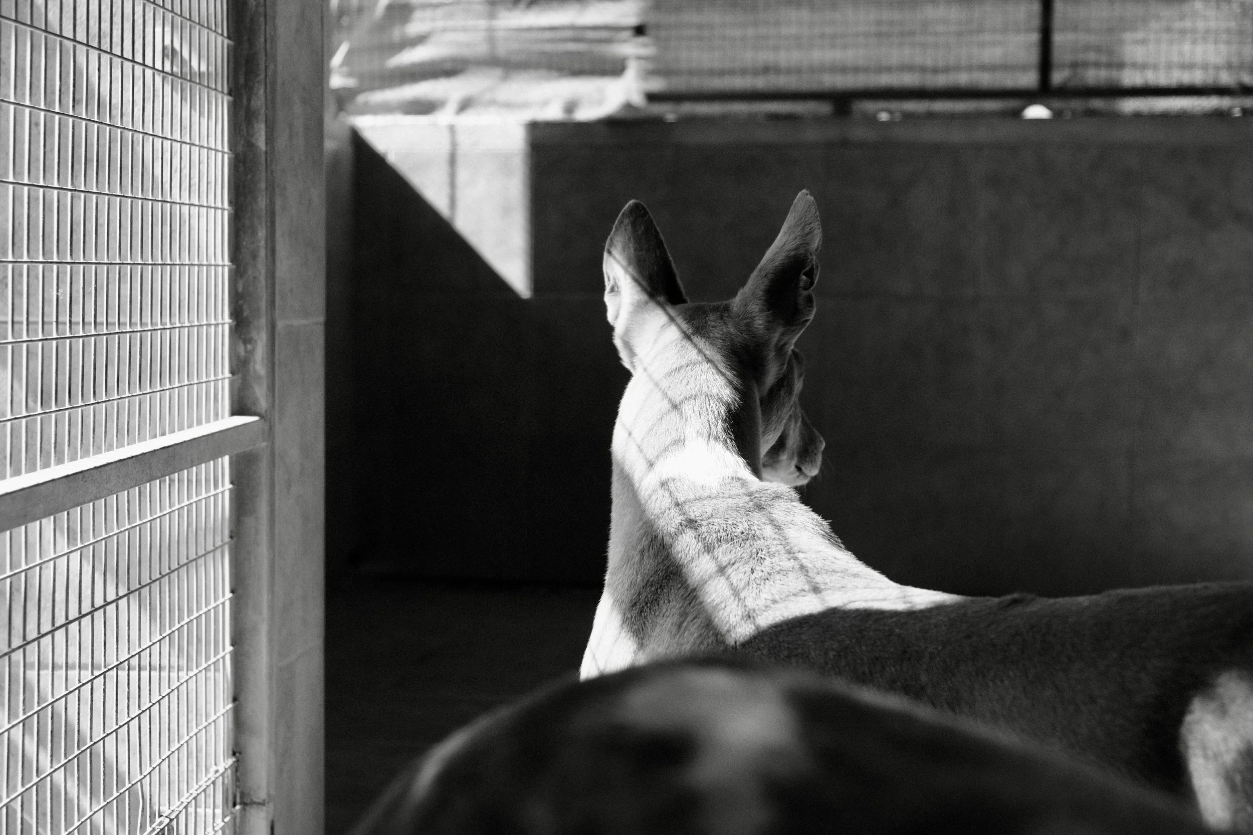 GHOSTS was researched and filmed on the Canary Islands and Andalusia in close cooperations with rescue centers on one hand and independent researching and observationon the other. The camera provides unflinching insights into the kennels of various dogs with behavioral problems or serious injuries. Two channels show explicit material of killed and abused dogs. Most of the recordings are looped to illustrate the state of suspension, which is independent of time and space. The view of the animals is simultaneously the perspective of the dogs' view through the bars, a world that is intangible for them, yet one they still yearn for. The animals' story, deliberately left unspoken.